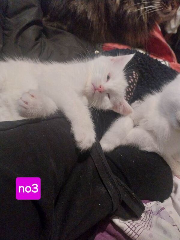 This wee man, is sooo playful, happy wee kitten. He has this really unusual markings ontop of his wee head....3 wee strokes n so he's called no3 π€£ these are referred to as kitten cap. As this wee boy grows, those caps will disappear and you'll be left with a stunning long haired white, and hopefully green eyed boy. (Currently hazel)